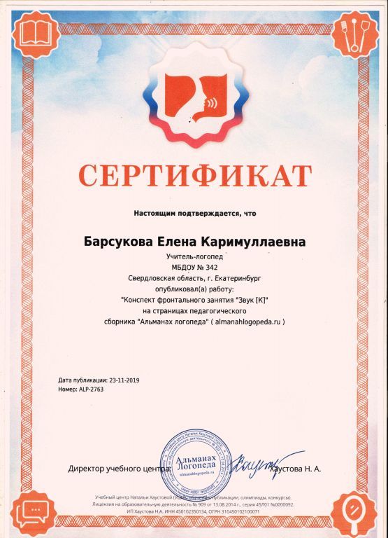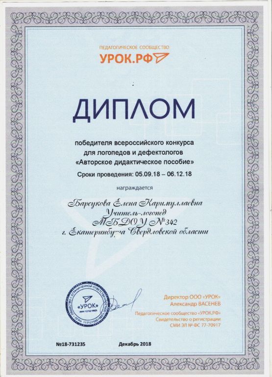 2019 - ФГБОУ высшего образования «Уральский государственный педагогический университет», «Технологии развития познавательной активности у детей 3-х лет с ограничениями жизнедеятельности при реализации индивидуальных программ ранней помощи»